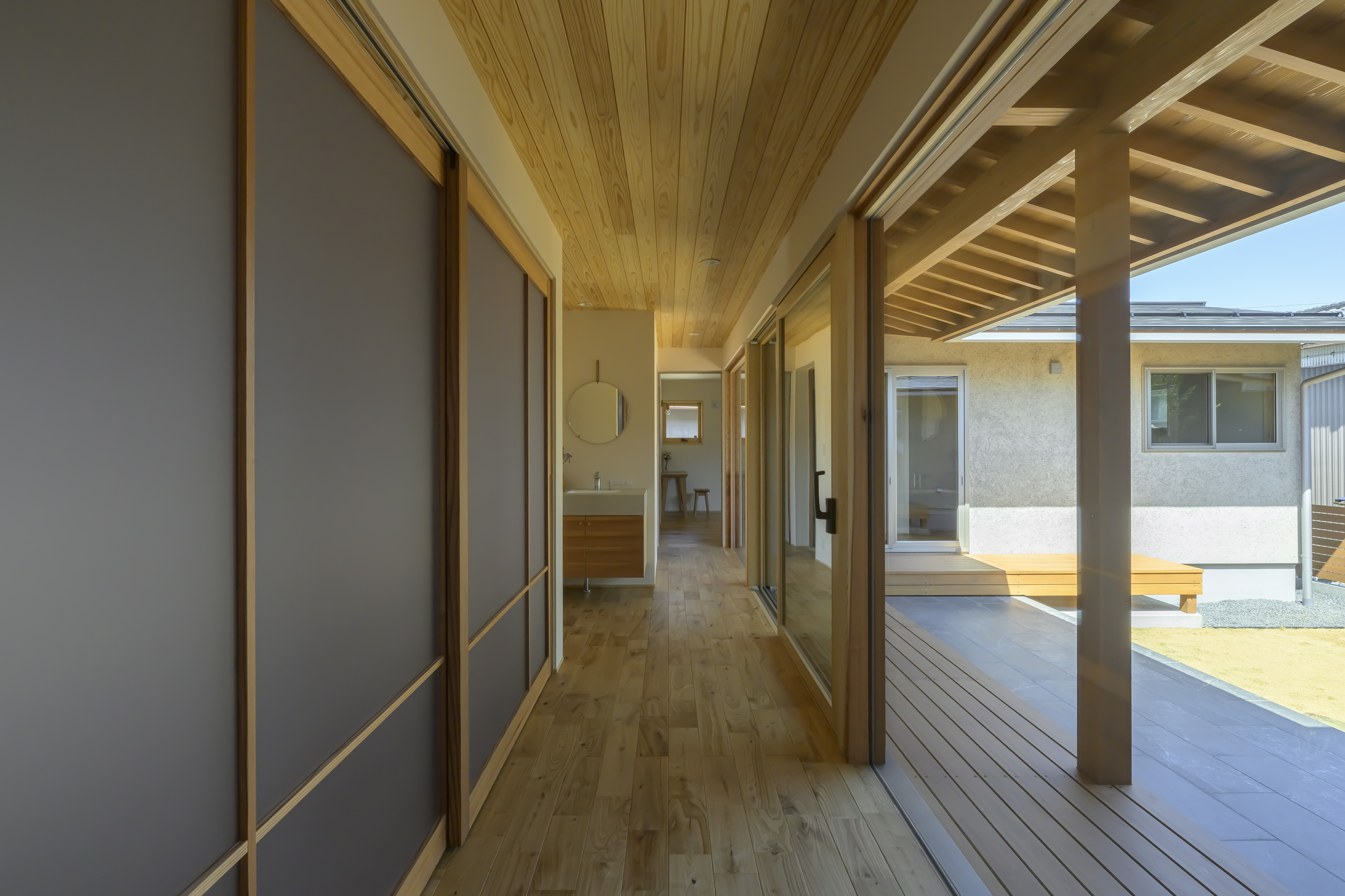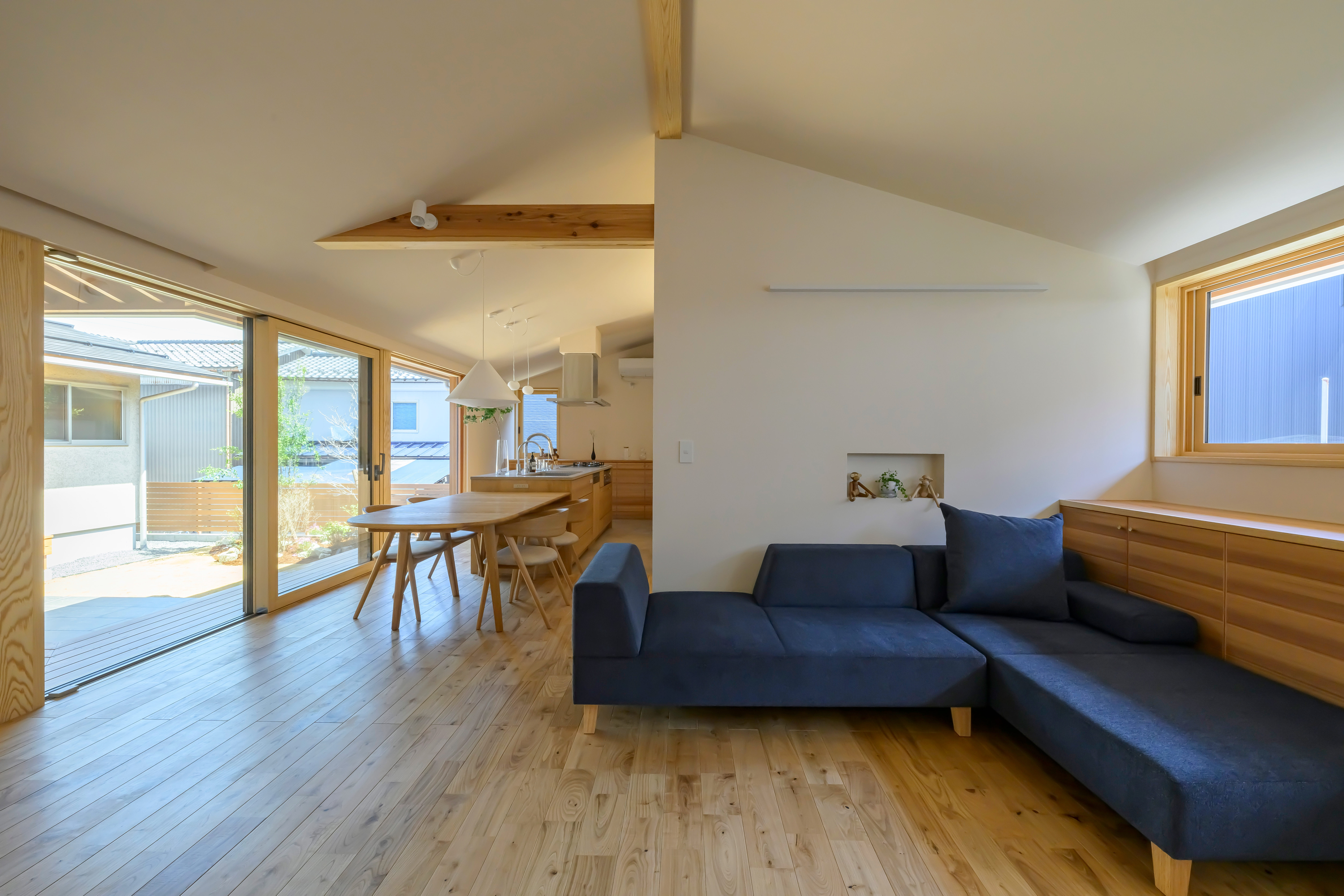ウッドデッキを介してリビングとゆるやかにつながり、中庭が暮らしの一部になります。