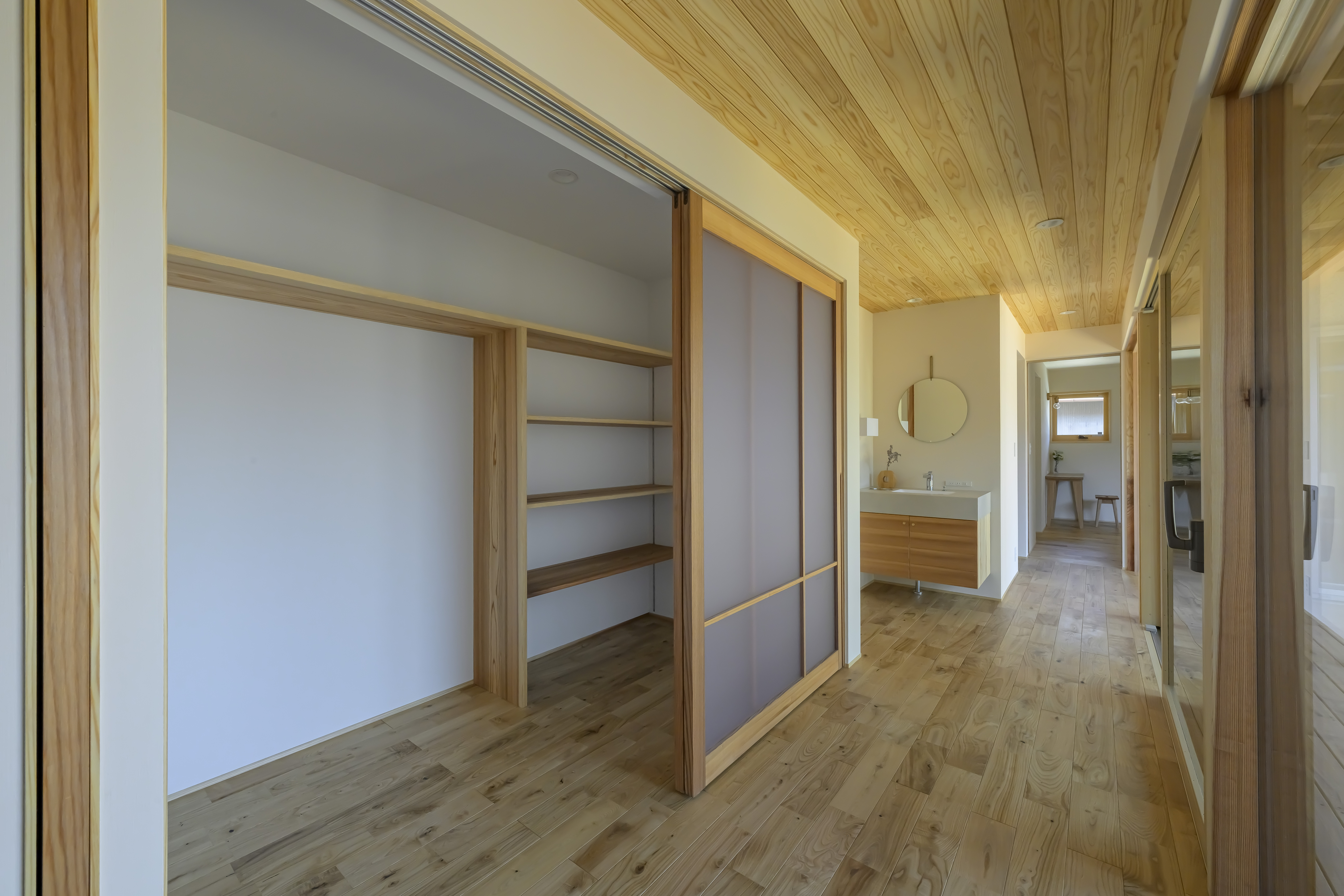 無垢材や漆喰をふんだんに使った室内は、調湿効果で夏はさらっと、冬はほんのり温か。ハイハイ時期の赤ちゃんにも安心で、化学物質によるシックハウス症候群のリスクを抑えた、家族に優しい住環境です。