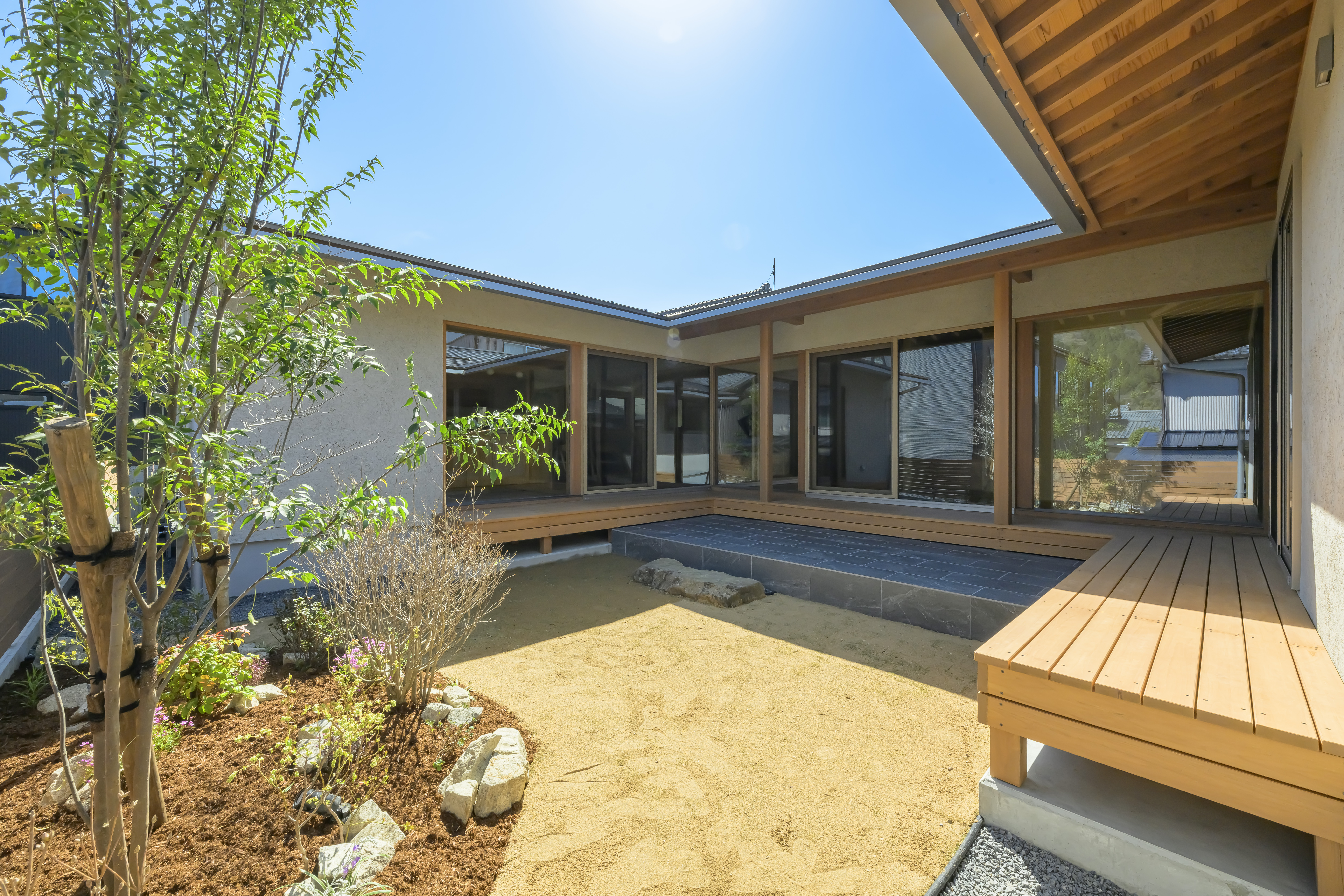 コの字型に建物で囲んだ中庭は、外からの視線を気にせず過ごせるプライベート空間。