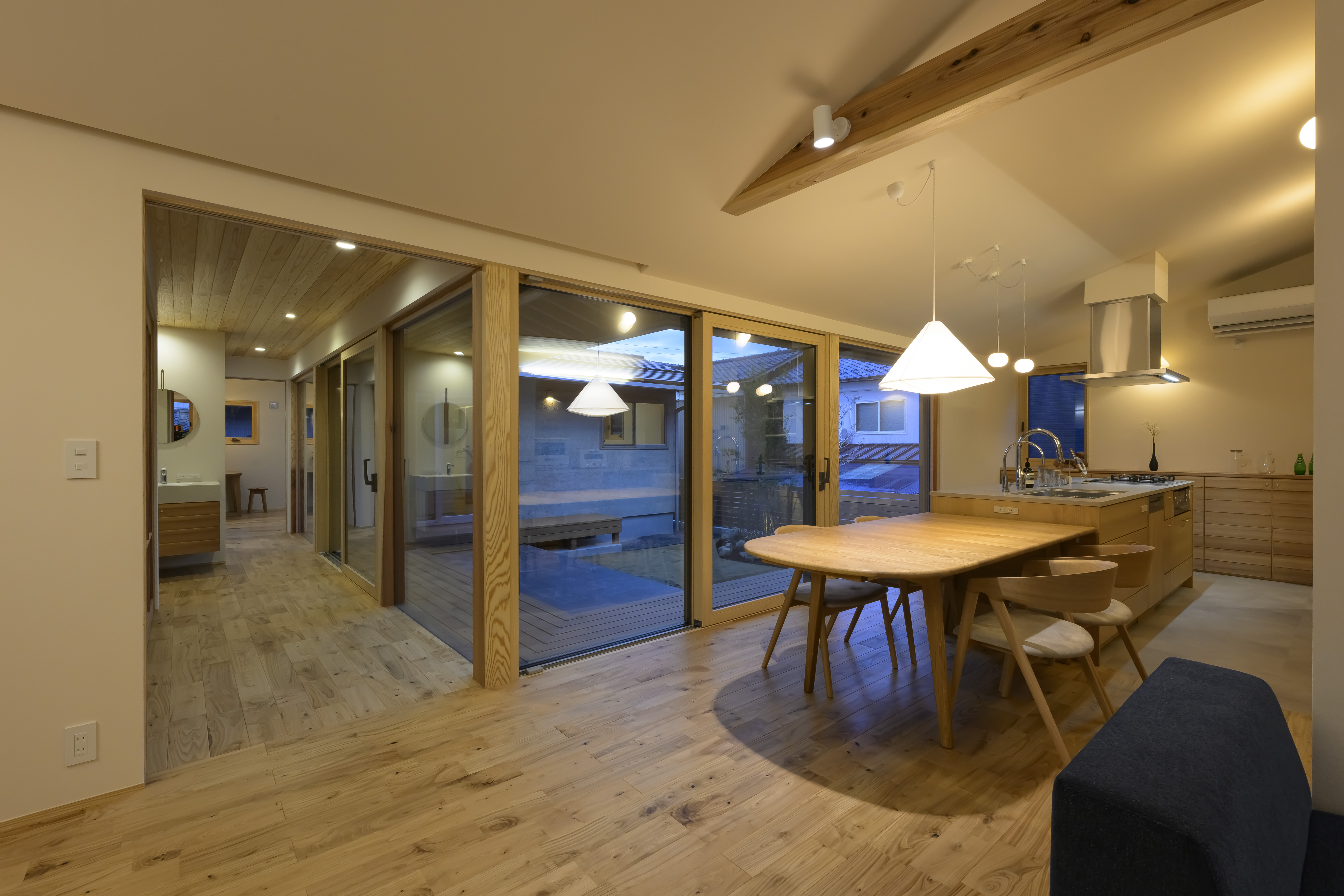 階段のない平屋は、家事動線がスムーズで日々の負担を軽減します。中庭の抜けによって視線が広がり、コンパクトながらも開放的。