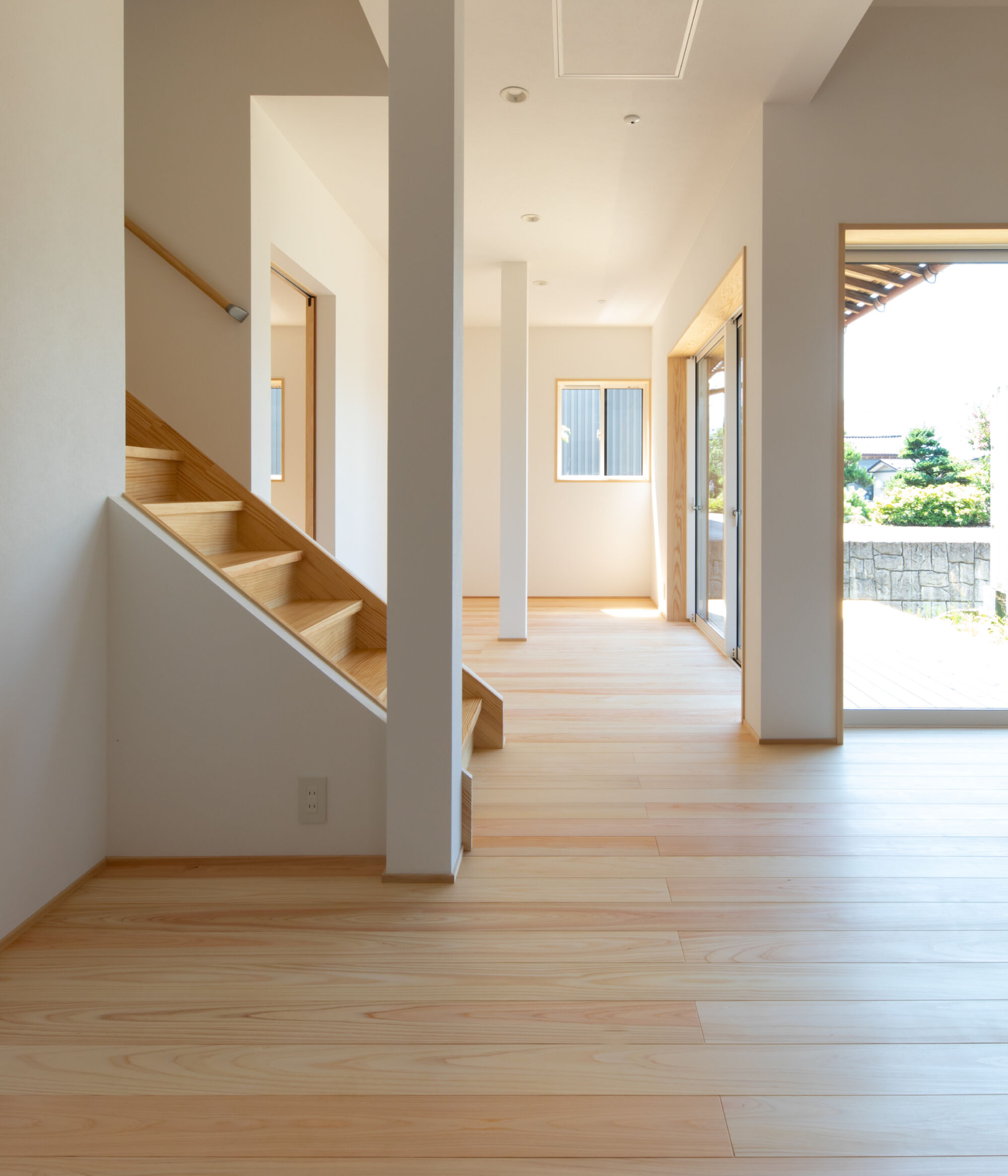 室内フローリングも桧やナラ材などの無垢板なら、冬でも足元がヒヤッとせず、裸足で過ごせる心地よさ。